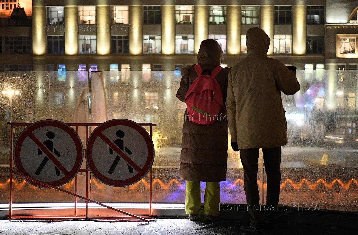 Виды Москвы. Жанровая фотография. Новогоднее оформление города. Девушки качаются на качелях на…
