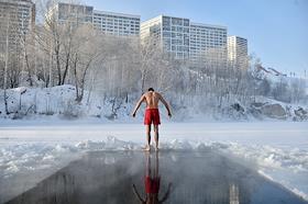 Genre photography. Fans of hardening and winter swimming while swimming in an ice hole on Lake…