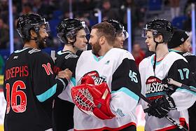 KHL All-Star Game at the SKA Arena. Goalkeeper Jeremy Smith (center) after the match.