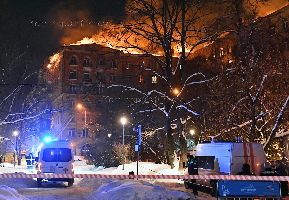 Пожар в шестиэтажном жилом доме на улице Черняховского возле метро "Аэропорт". Площадь пожара кровли…