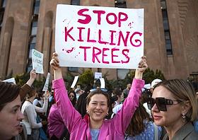 Акция протеста против вырубки деревьев прошла перед зданием мэрии. Участники во время акции.