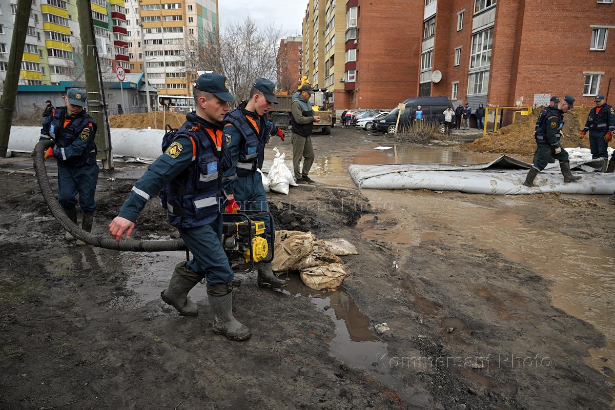 Последствия наводнения в Кургане. Сотрудники МСЧ России во время установки водоналивной…