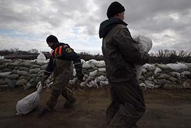 Паводок в Кургане. Работы по укреплению дамбы. Жанровая фотография. Укладка мешков с песком в центре…