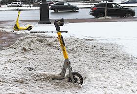 Жанровая фотография. Весенний снегопад в городе. Заснеженная стоянка проката электросамокатов.