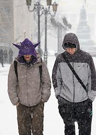 Жанровая фотография. Весенний снегопад в городе. Молодые люди идут по улице во время снегопада в…