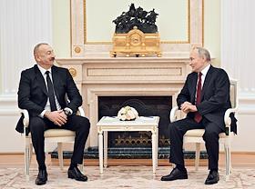Президент России Владимир Путин (справа) и президент Азербайджана Ильхам Алиев (слева) во время…