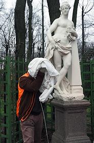 Виды Санкт-Петербурга. Жанровая фотография. Раскрытие скульптур Летнего сада. Специалисты снимают со…
