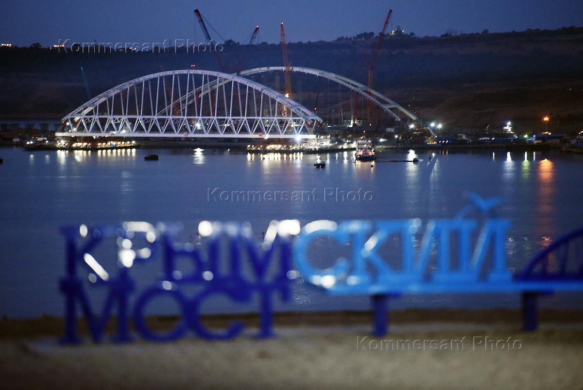 Строительство Крымского моста в Керченском проливе, который свяжет Крым с материковой Россией.