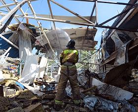 Последствия утреннего обстрела Киевского района в Донецке. Сотрудники пожарной службы МЧС России во…