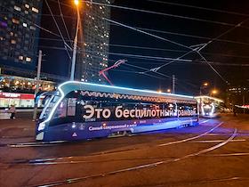 Self-driving tram "Lion Moscow" in test mode carries passengers on route No. 10 ("Schukinskaya metro…