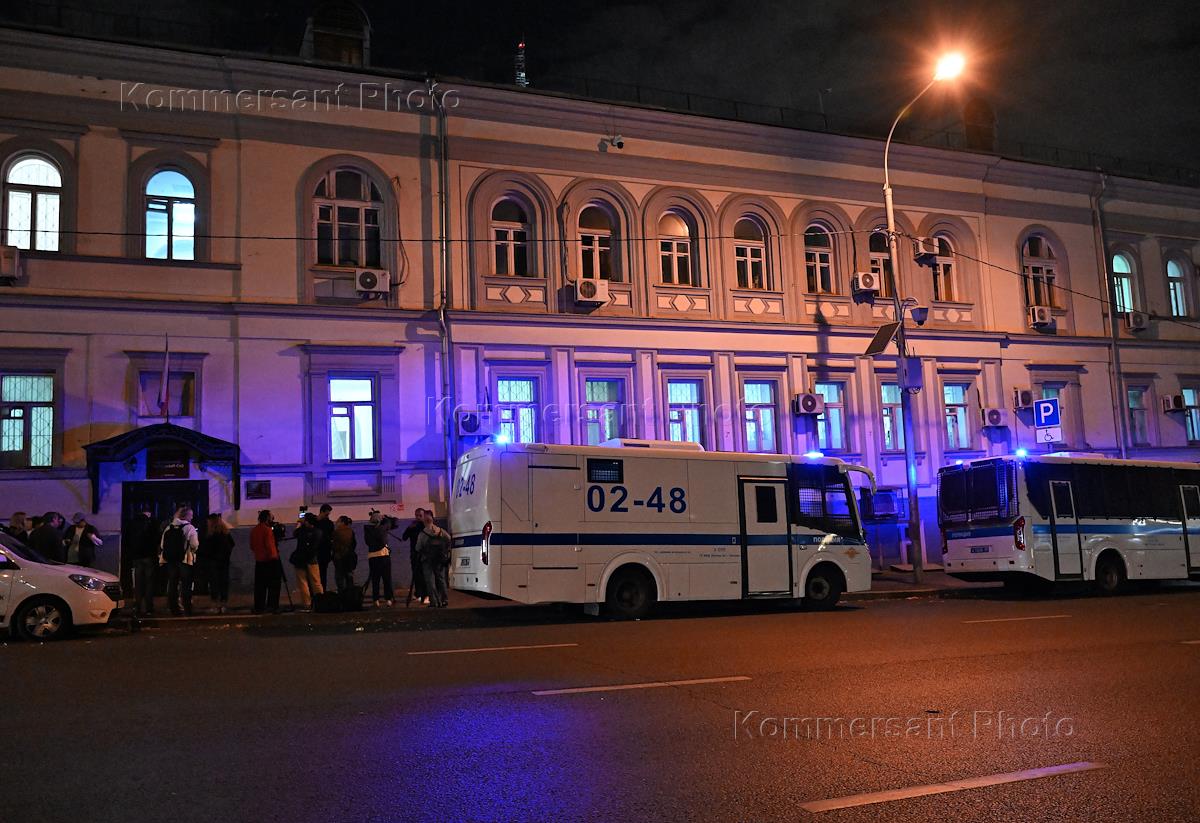Ситуация у Басманного районного суда. Жанровая фотография. Автомобиль полиции и журналисты у суда.