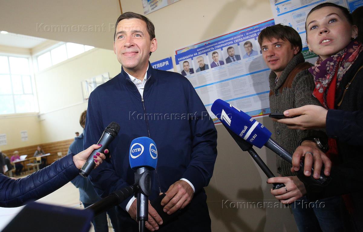 Единый день голосования. Губернатор Свердловской области Евгений Куйвашев (слева) во время…
