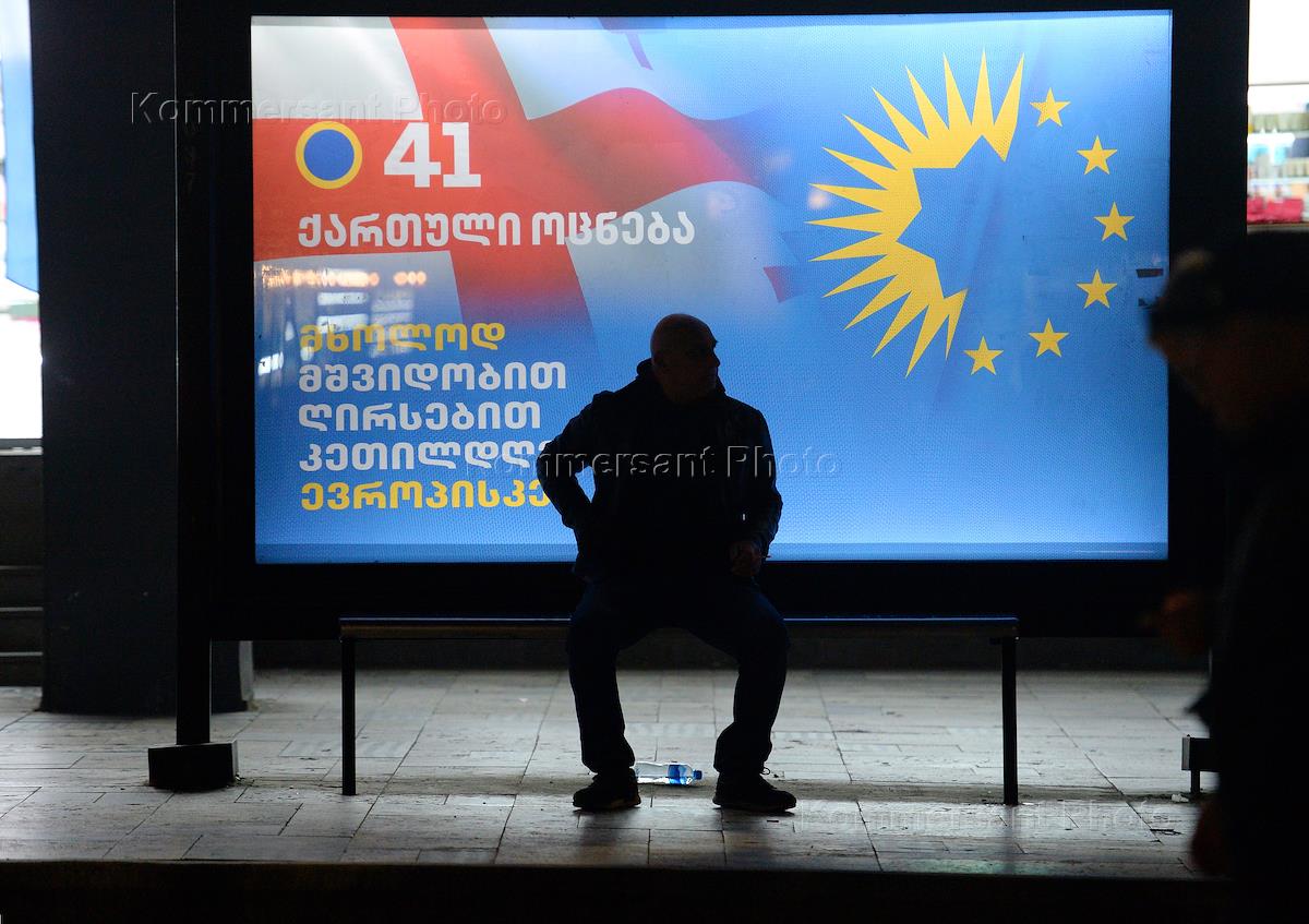 Предвыборная агитация в Тбилиси. Жанровая фотография. Баннер партии "Грузинская мечта" на улице…
