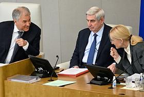 Plenary meeting of the State Duma of Russia. From left to right: Chairman of the State Duma of…