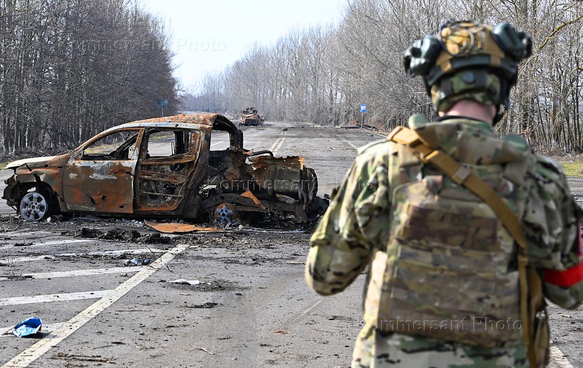 Ситуация в Курской области. Разбитая и сгоревшая гражданская техника на дороге.