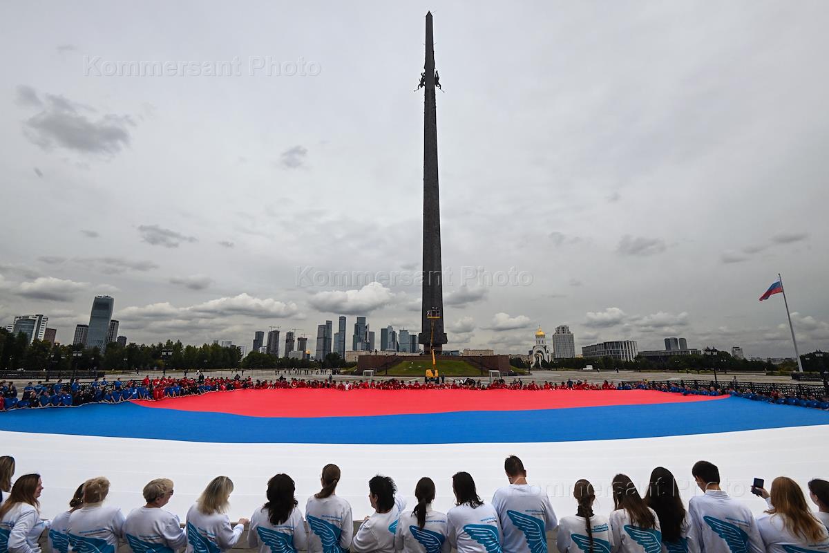 Празднование Дня Государственного флага России на Поклонной горе у Музея Победы. Участники во время…