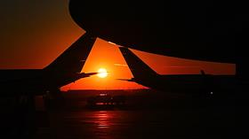 Minsk views. Genre photography. Airplanes on the tarmac of Minsk National Airport at sunset.