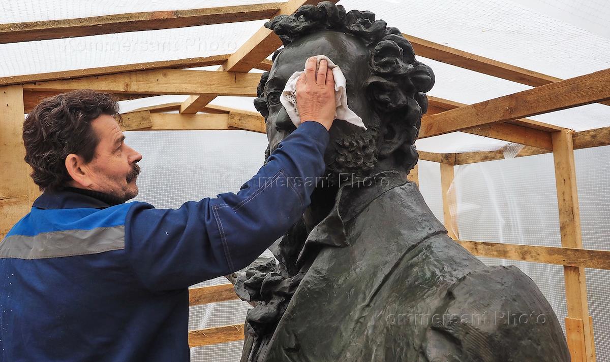 St. Petersburg views. Genre photography. A restorer during restoration work on the Pushkin monument…