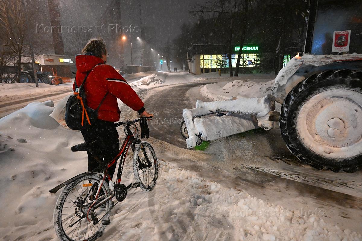 Genre photography. Snowfall in the city. Snow removal equipment during snow removal.