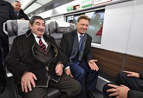 Церемония запуска двухэтажного "Аэроэкспресса" производства швейцарской компании Stadler на Киевском…