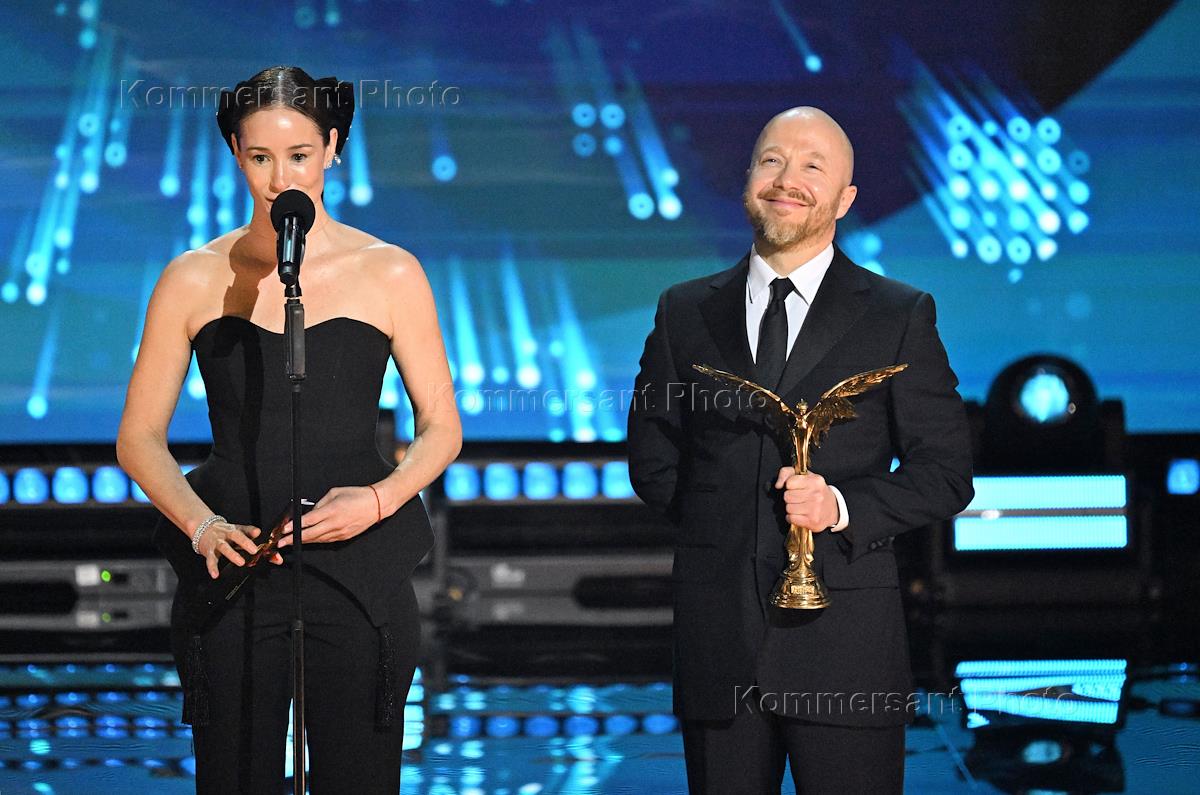The 39th Nika Film Awards ceremony at the Mossovet Theatre. Actors Olga Sutulova (left) and Yevgeny…