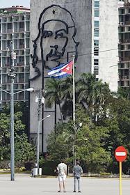 Виды Гаваны. Мужчина стоит на улице города под Государственным Флагом Кубы.