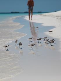 Жанровая фотография. Молодой в футболке с изображением флага США сидит на пристани Карибского моря.