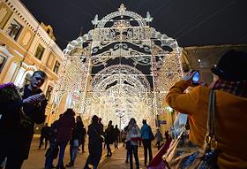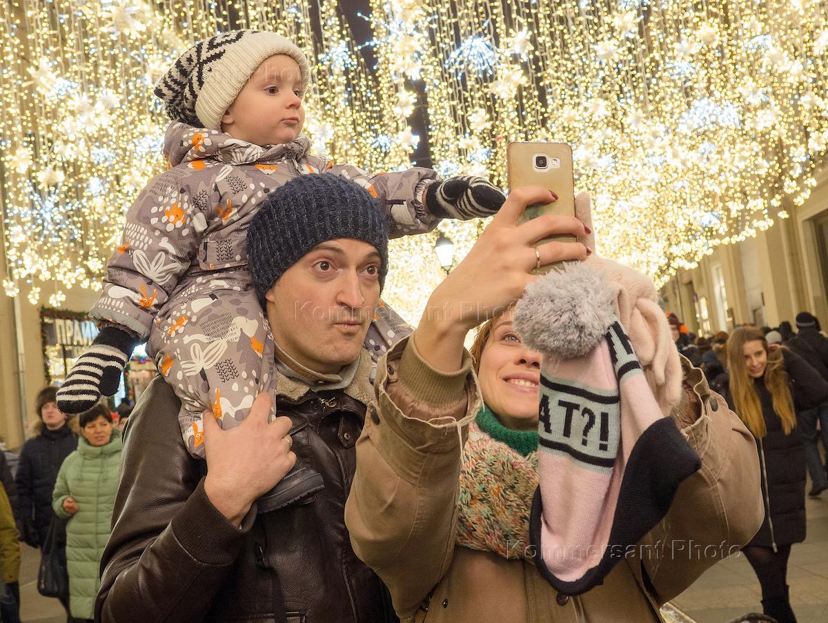 Виды Москвы. Новогоднее убранство города. Отдыхающие делают селфи на улице Большая Дмитровка.