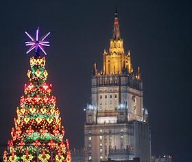 Здание Министерства иностранных дел (МИД) России на Смоленской площади. Новогоднее убранство города.