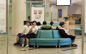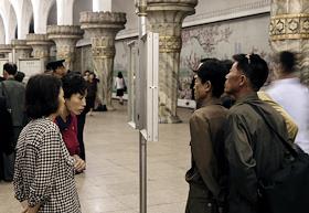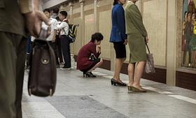 Женщины Северной Кореи. Уставшая женщина присела на корточки в ожидании поезда метро. В КНДР нет…