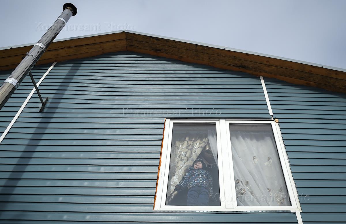 Семья переселенцев из Таджикистана Джураевых в селе Легково. Маленький ребенок на крыше дома.
