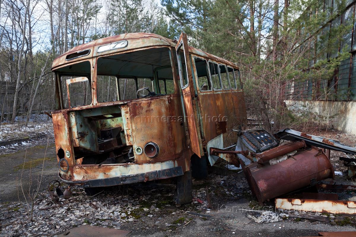 Чернобыль - 30 лет после аварии на Чернобыльской атомной электростанции (ЧАЭС). Старый автобус в…