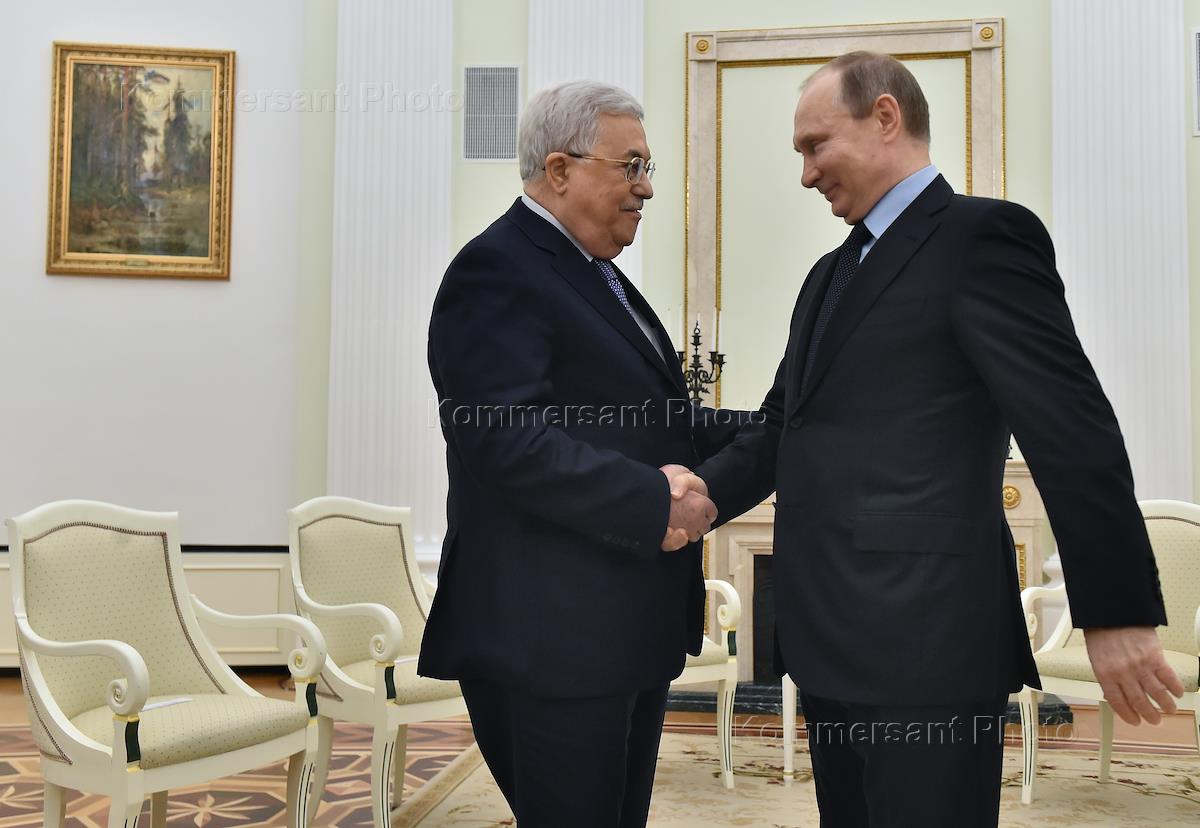 Президент России Владимир Путин (справа) и президент Государства Палестина Махмуд Аббас (слева) во…