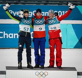 XXIII Зимние Олимпийские игры в Пхенчхане. Биатлон. Мужская индивидуальная гонка. Слева направо:…