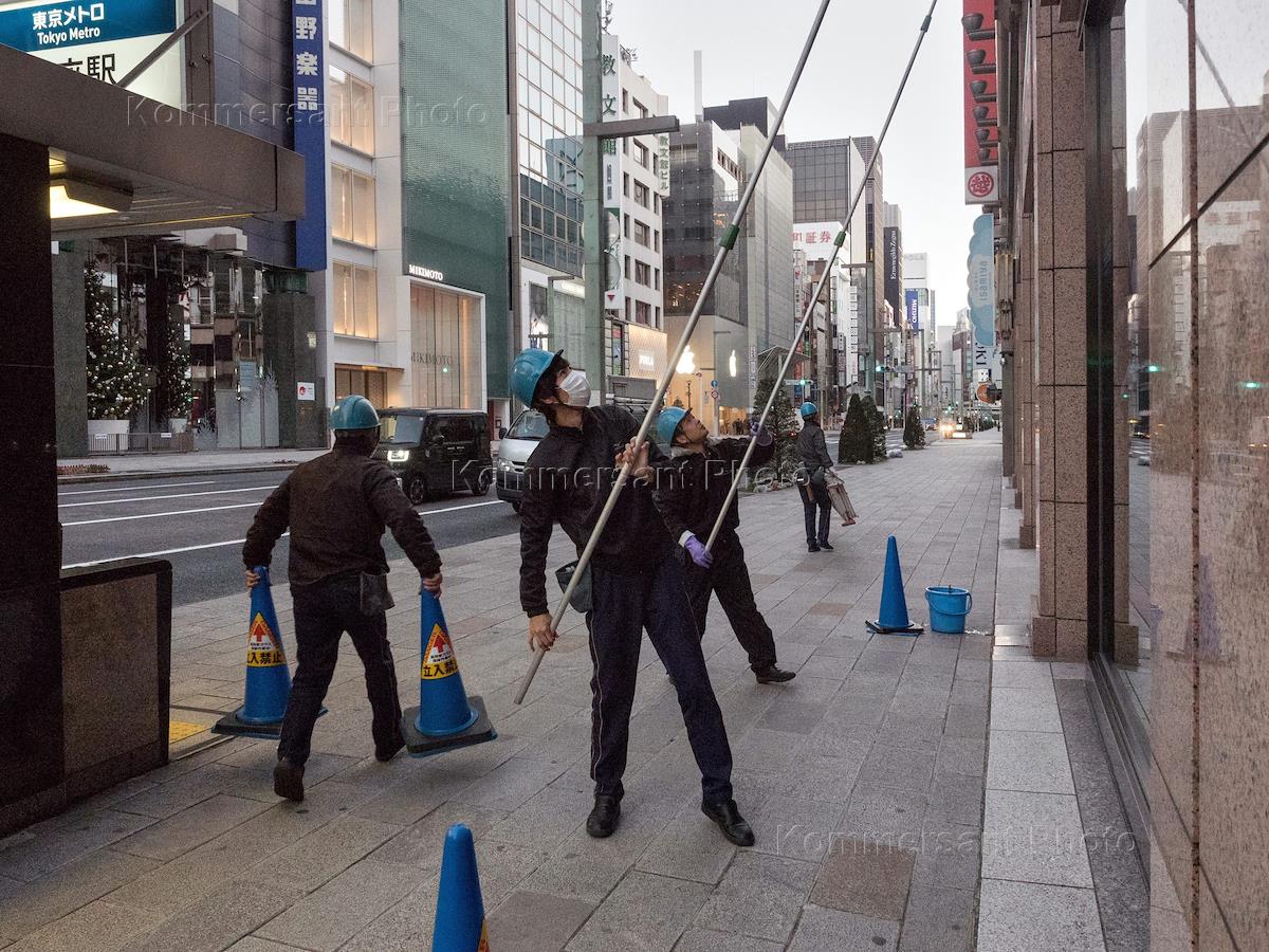 Виды Токио. Район Гиндза. Улица Chuo Dori. Мойщики окон во время утренней мойки витрин.