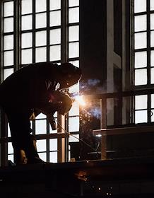 Слесарь-монтажник Сергей Кудряшов в процессе подъема нового сегментного затвора для замены на…