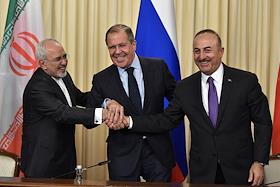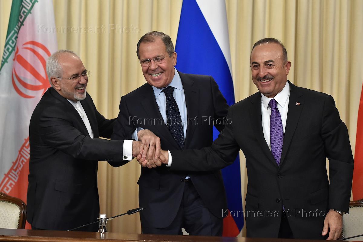 Переговоры министров иностранных дел России, Ттурции и Ирана в Доме приемов МИД России. Слева…