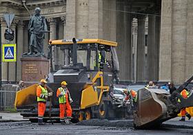 Ремонт Невского проспекта. Сотрудники ремонтно-дорожной организации и спецтехника во время укладки…