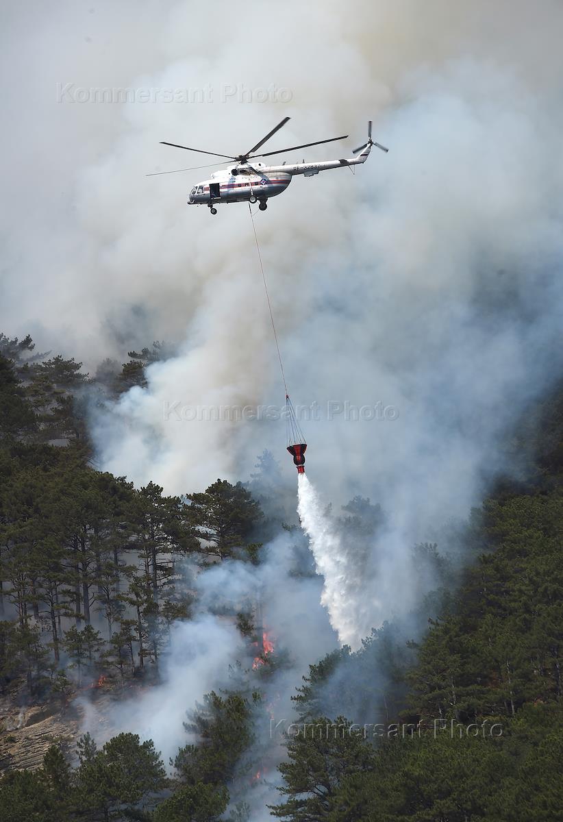 Пожар в Ялтинском горно-лесном заповеднике. Спецтехника рядом с очагом пожара. Вертолет Ми-8…