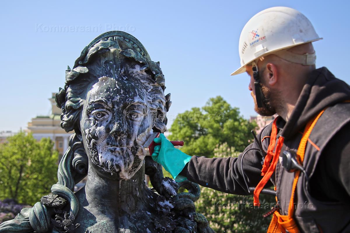 Плановые работы по очистке памятника Екатерине Второй в Екатерининском сквере.