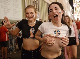Чемпионат мира по футболу в России FIFA 2018. Болельщицы в фан-зоне на Никольской улице.