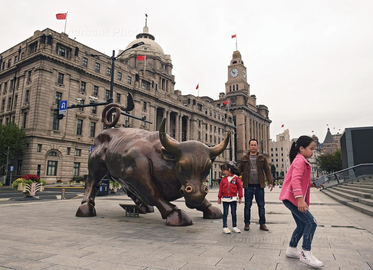 Виды Шанхая. Набережная Вайтань. Скульптура "Атакующий бык", копия скульптуры находящейся в…