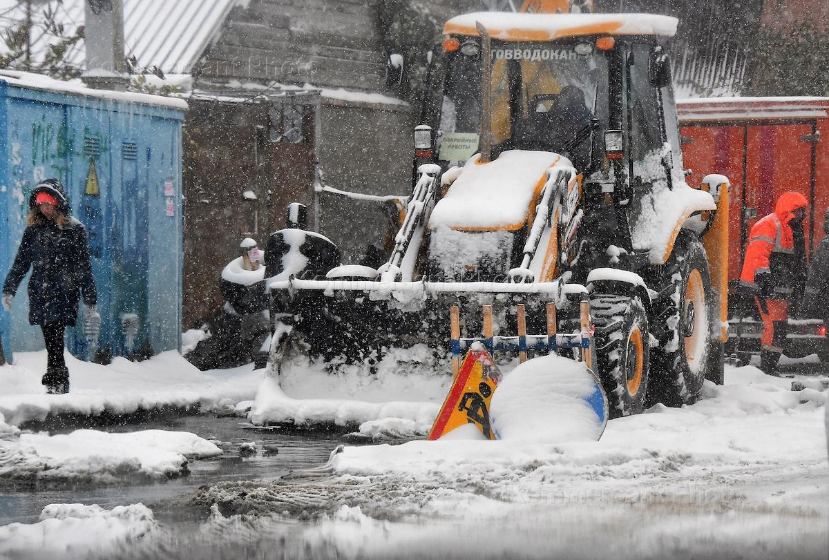 Жанровая фотография. Трактор в снегу на дороге со снегом и лужами одновременно.