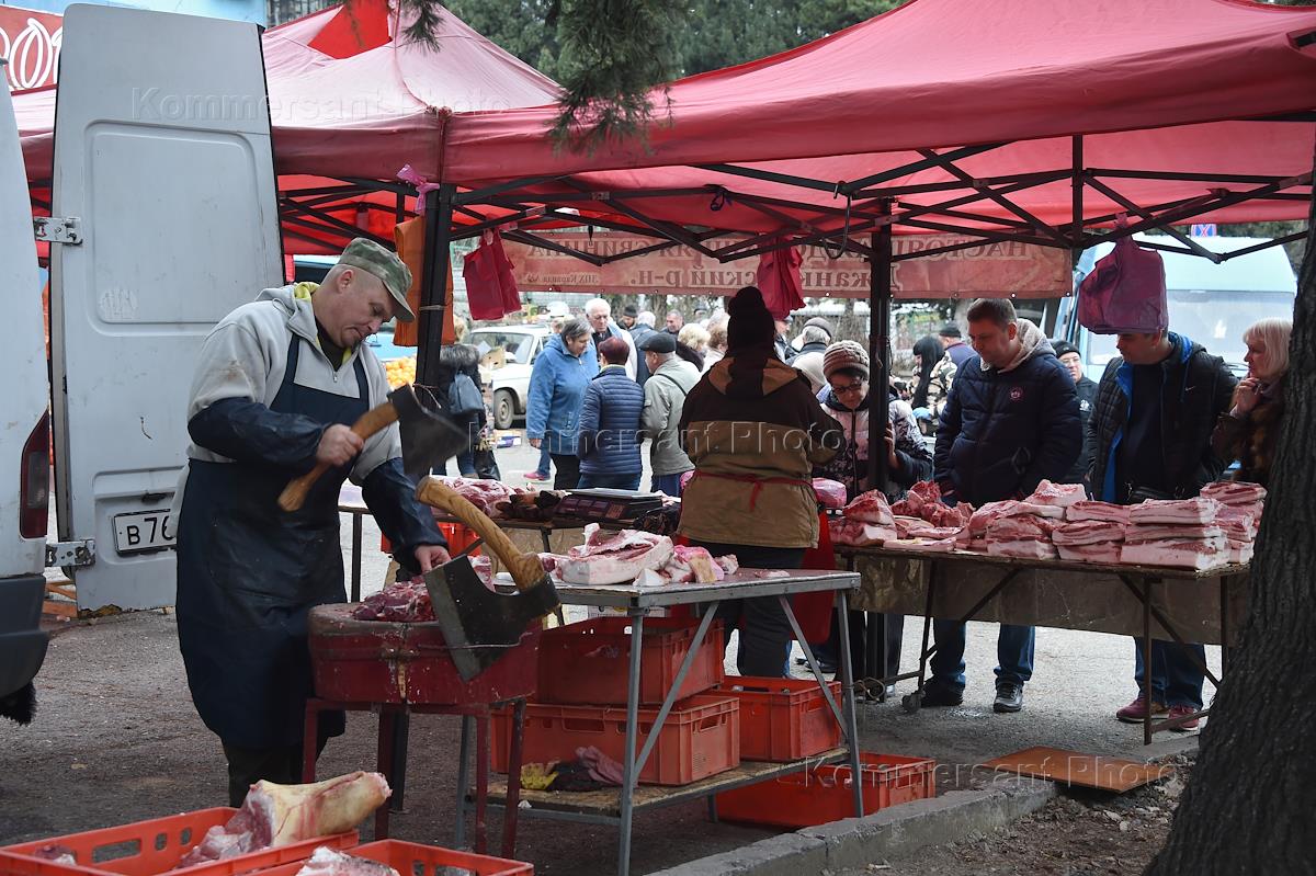 Жанровая фотография. Торговля мясом на продуктовом рынке в Симферополе.
