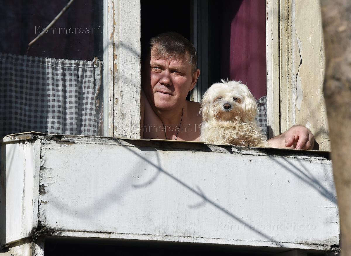 Виды Москвы. Пятиэтажные жилые дома в Пресненском районе. Житель пятиэтажки с собакой у окна.