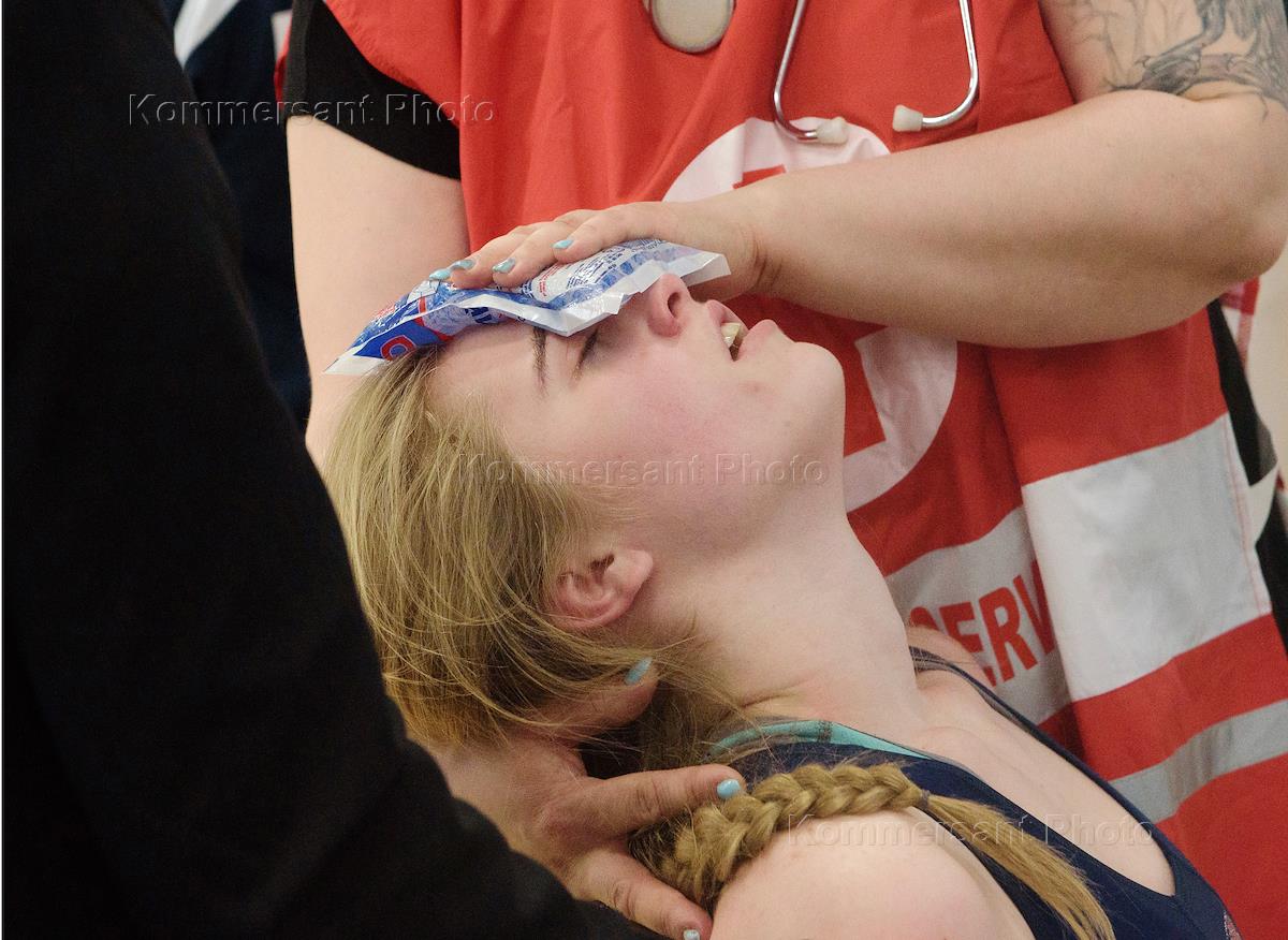 Медсестра оказывает первую помощь, участнице первенства Москвы по сумо Марие Райденко.