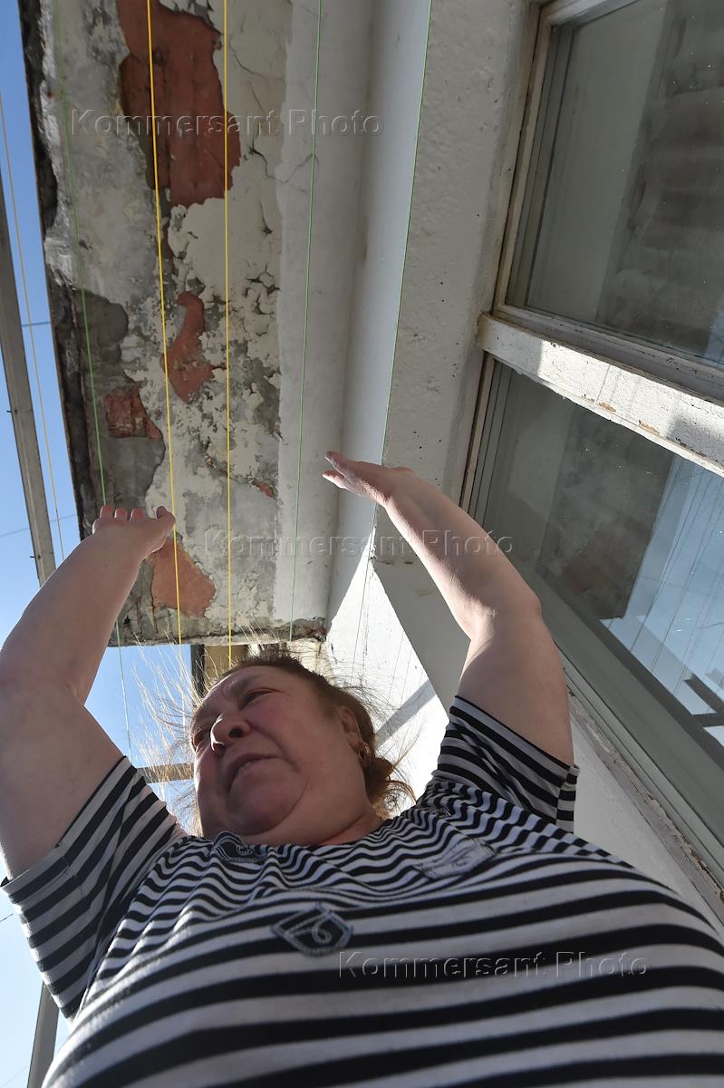 Виды Москвы. Пятиэтажные жилые дома в Пресненском районе. Жительница пятиэтажки показывает на…