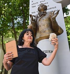 Воронежский краевед Ольга Рудева с томиком и бюстом Пушкина в руках возле памятника Пушкину.