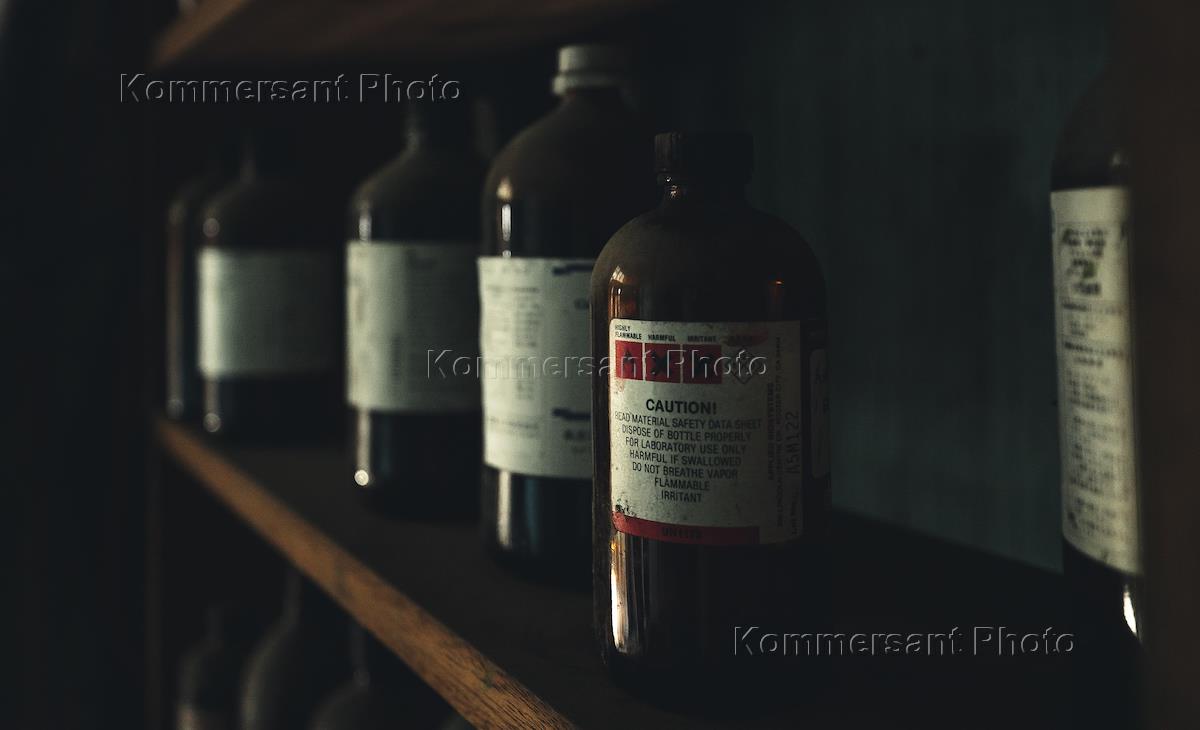 Заброшенная научная лаборатория в пригороде Сеула. Жанровая фотография. Бутылки с химикатами.