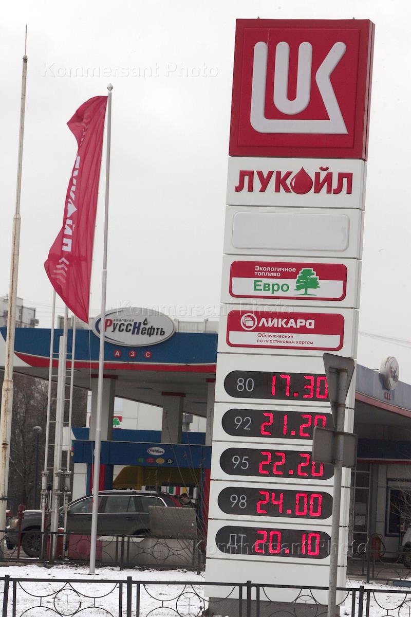 Замена логотипов "Русснефть" на "Лукойл" на автомобильной заправочной станции.